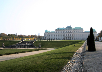 Hier sieht man das Obere Belvedere mit seinem fürstlichen Prunk- und Lustgezelt mit den treppenartigen Gartenanlagen, die das unterschiedliche Niveau der beiden Schlösser spielerisch überbrücken. | |||||